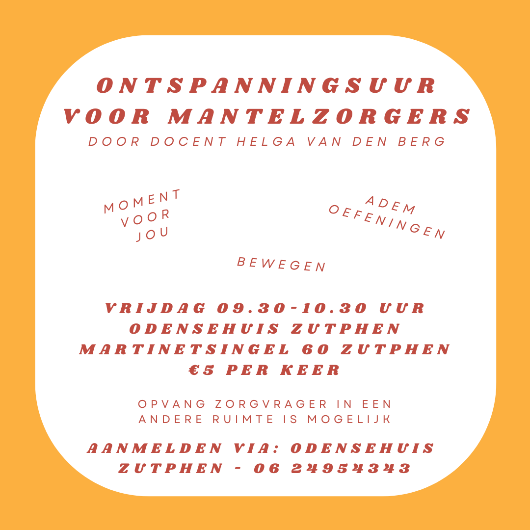 Het ontspanningsuur is onder leiding van Helga van den Berg en alleen voor mantelzorgers (naasten) van mensen die zorg hebben voor iemand met geheugenproblemen (dementie, NAH, ouderdomsvergeetachtigheid).